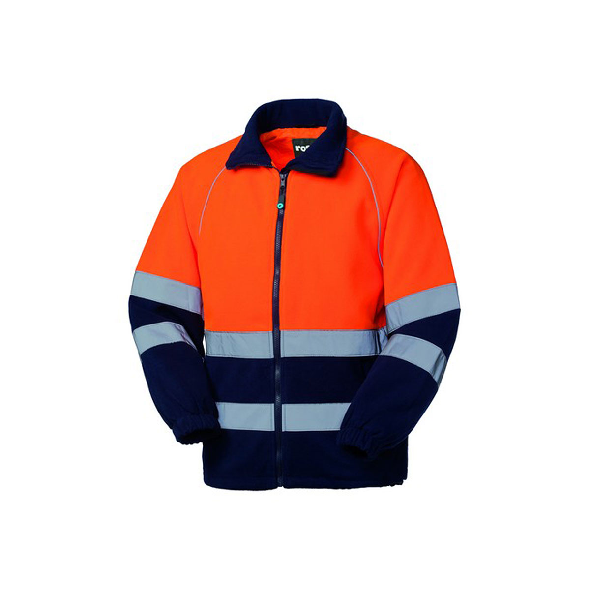 Pile alta visibilità con chiusura anteriore con cerniera centrale aperta fino al fondo, maniche raglan con profilo rifrangente. |