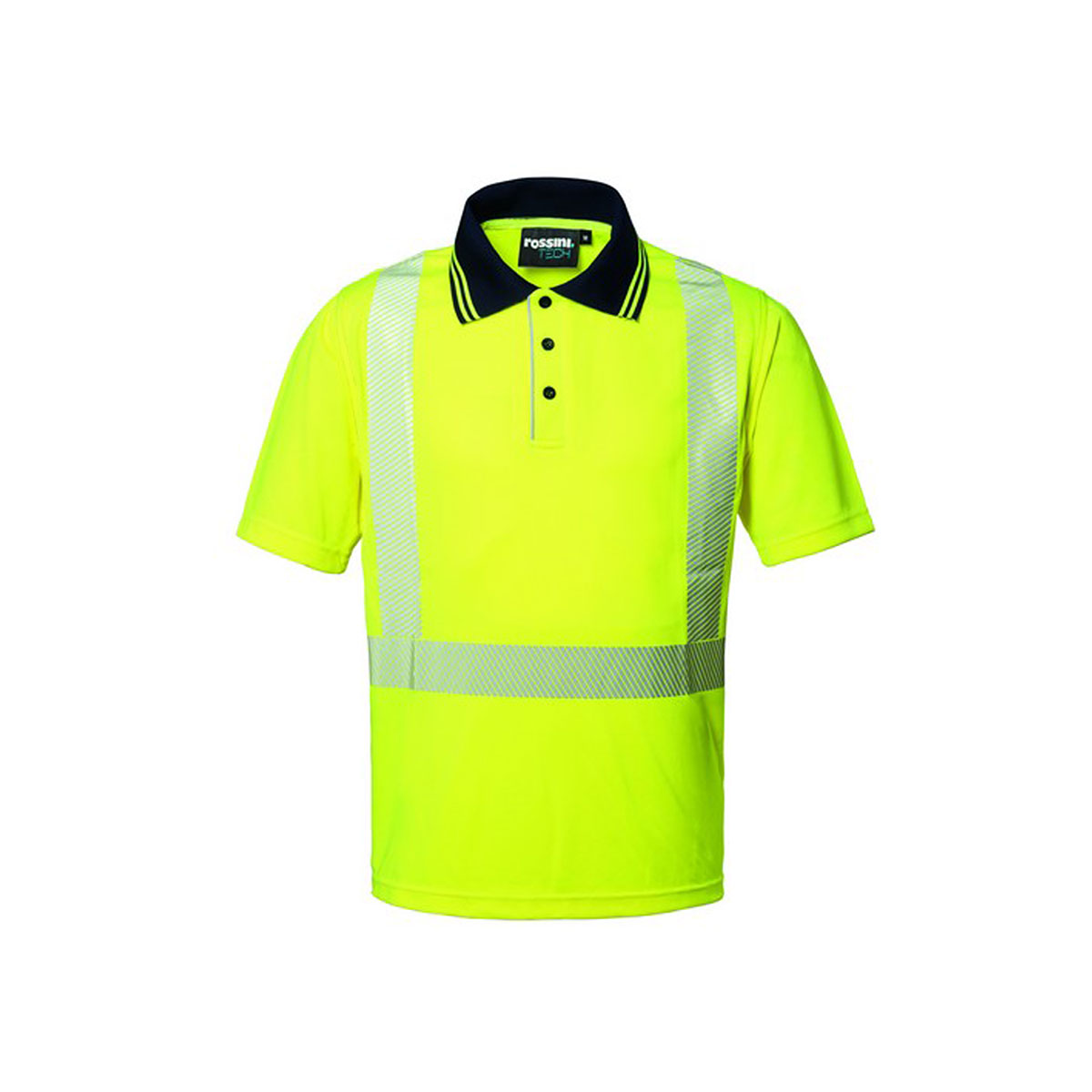 Polo alta visibilità con collo con profili di colore a contrasto chiuso con tre bottoni, profilo rifrangente all’abbottonatura. |