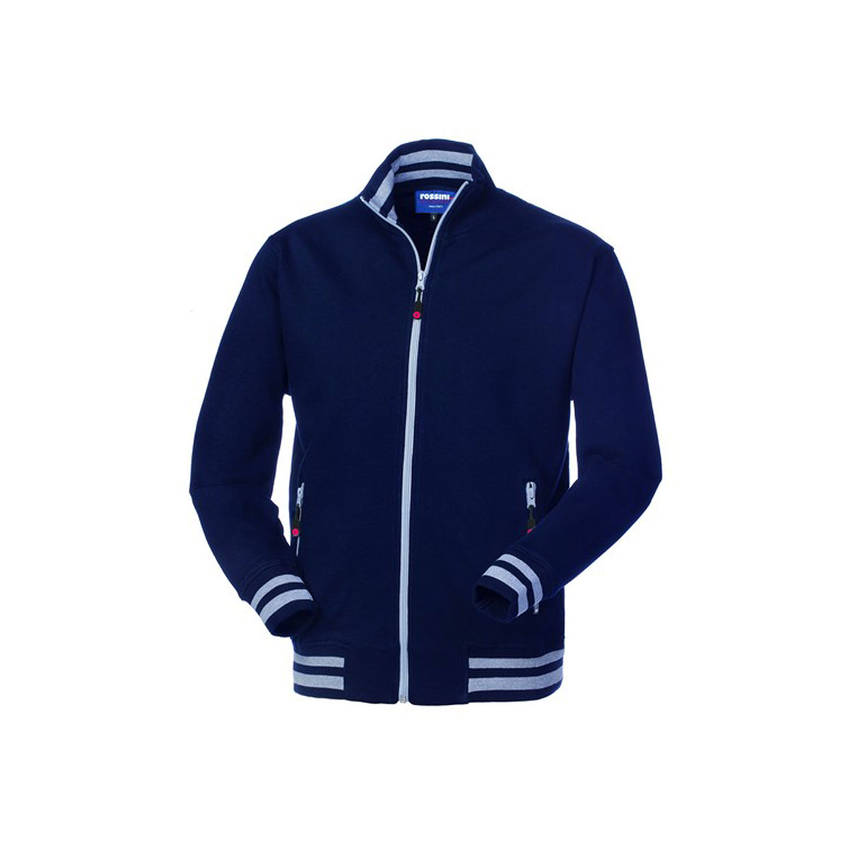 Felpa con chiusura centrale con cerniera in plastica, collo in maglia elastica di colore in tinta con inserti di colore a contrasto interno, parasudore interno al collo. |