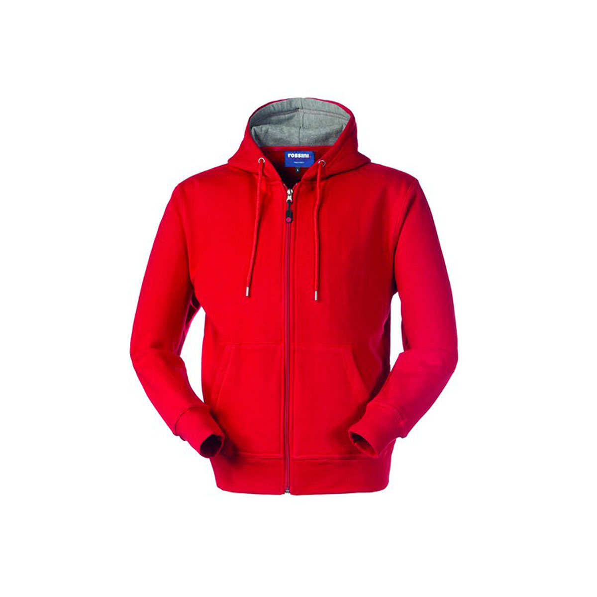 Felpa con chiusura centrale con cerniera in plastica, interno del cappuccio di colore a contrasto, cappuccio chiuso con cordino, parasudore interno al collo. |