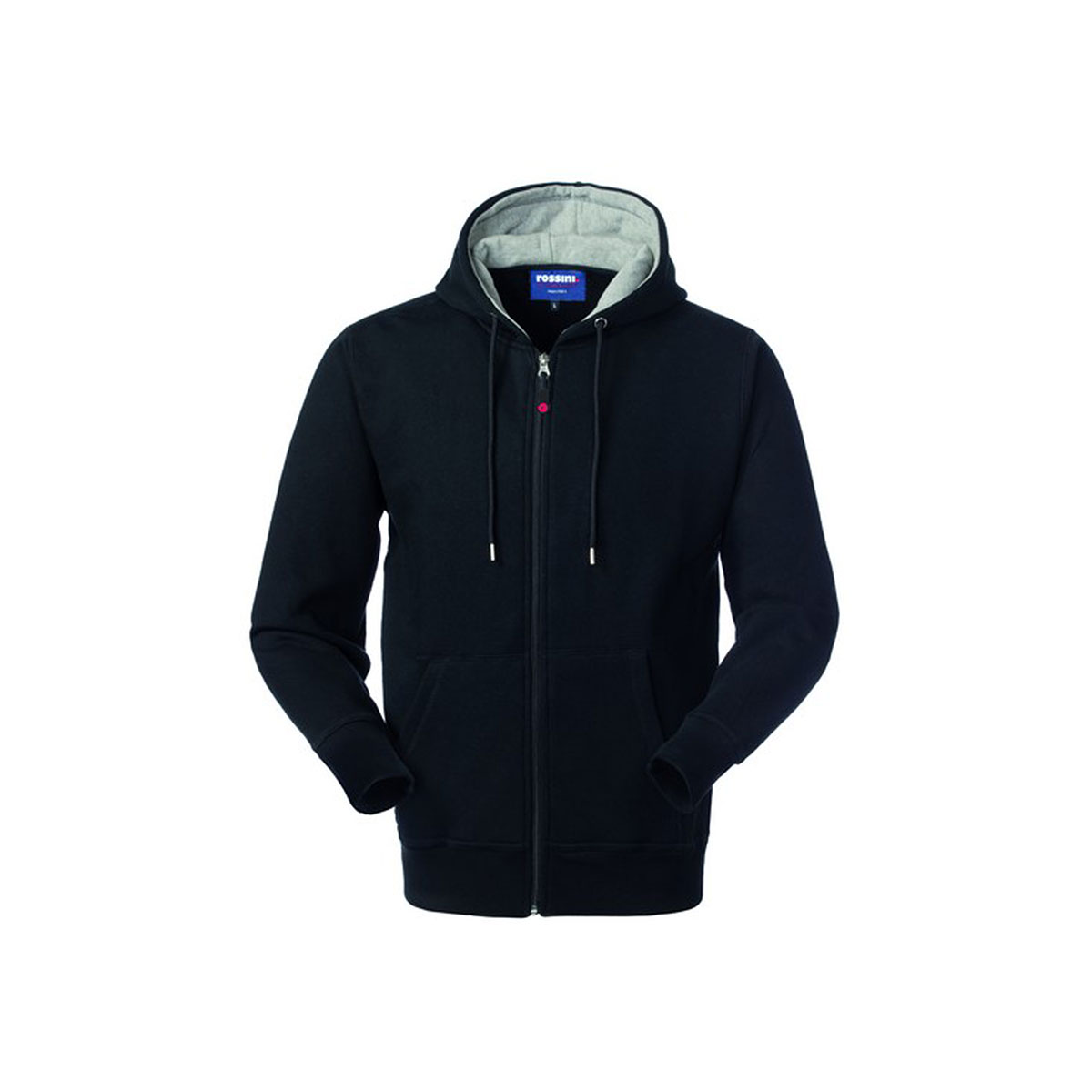 Felpa con chiusura centrale con cerniera in plastica, interno del cappuccio di colore a contrasto, cappuccio chiuso con cordino, parasudore interno al collo. |