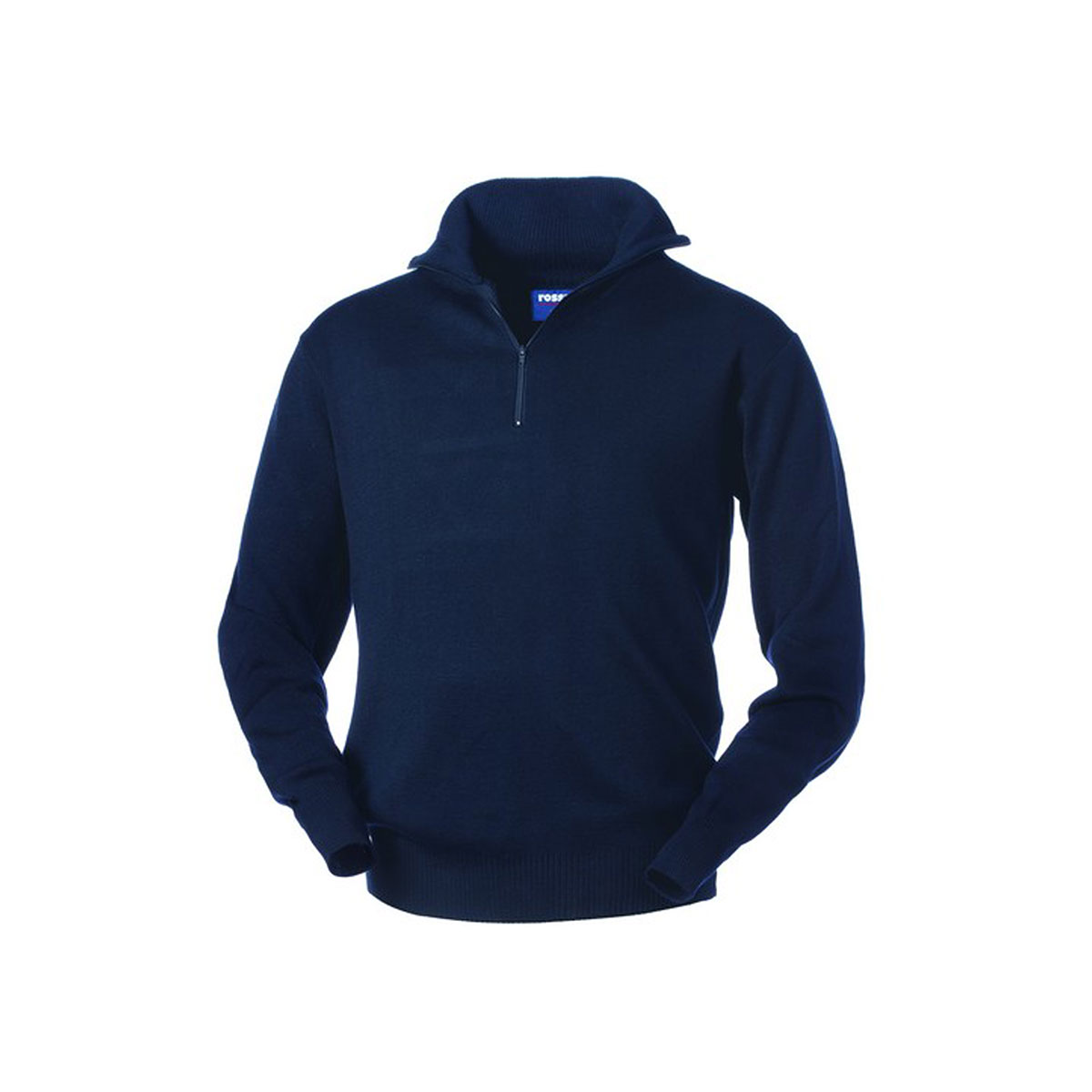 Maglione con lavorazione a maglia tinta unita su macchina rettilinea, finezza 12, cucita con rimagliatrice, polsi e fascia girovita in maglia elastica. |