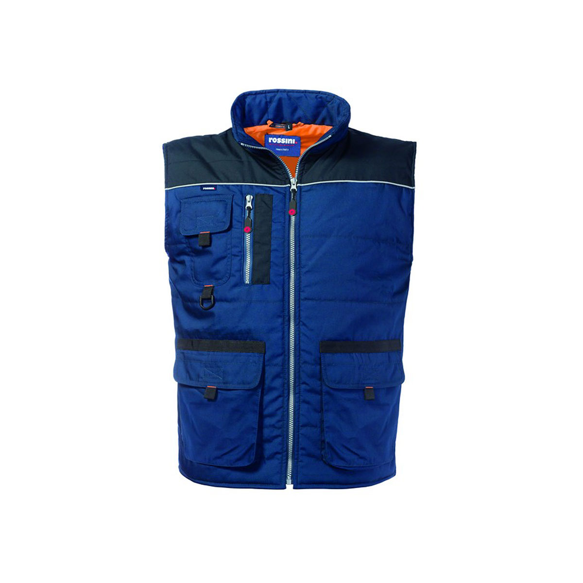 Gilet imbottito con chiusura anteriore con cerniera, elastico interno al giromanica antifreddo e antivento, coda di topo rifrangente al carré anteriore e posteriore.