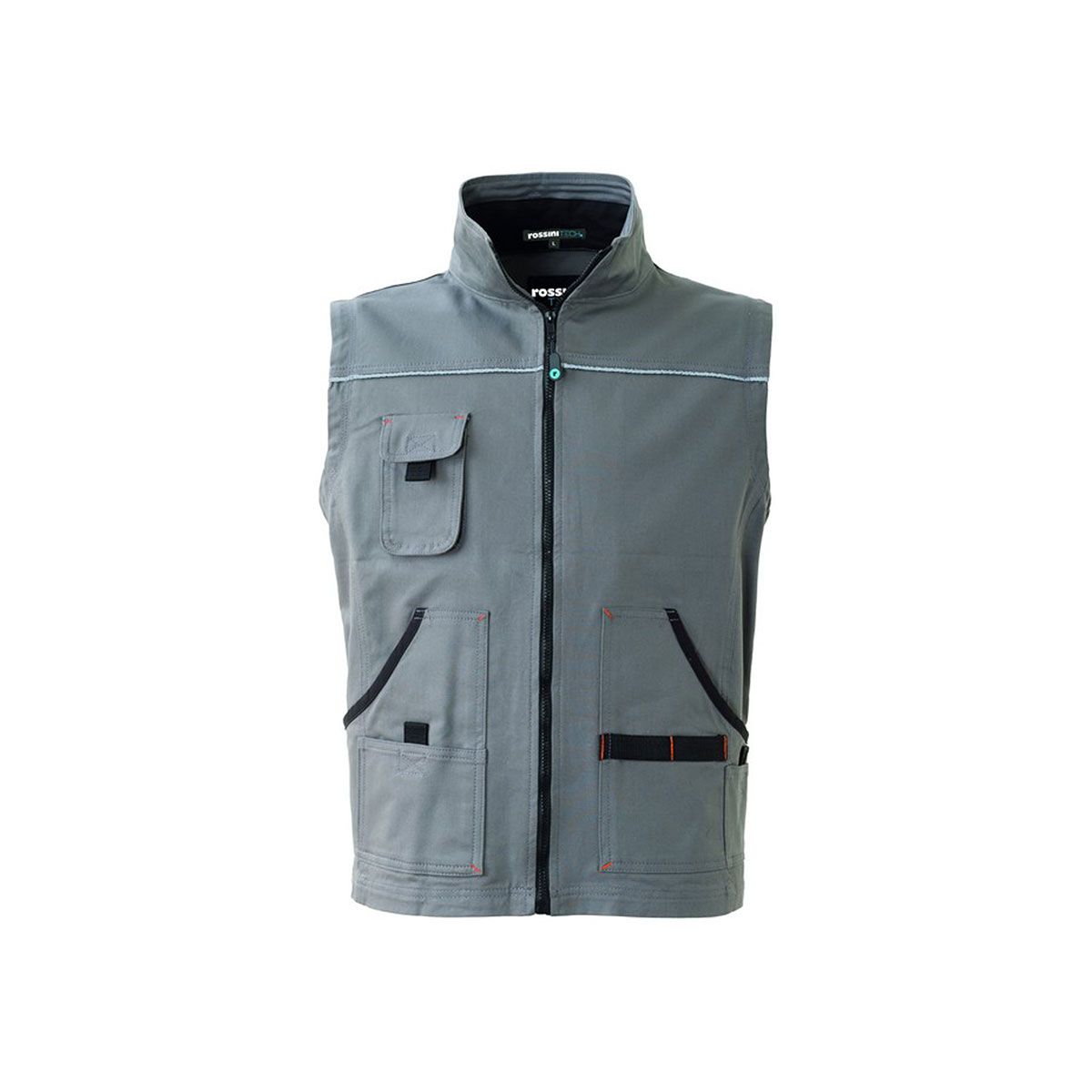 Gilet da lavoro con collo alla coreana e chiusura anteriore con cerniera. |