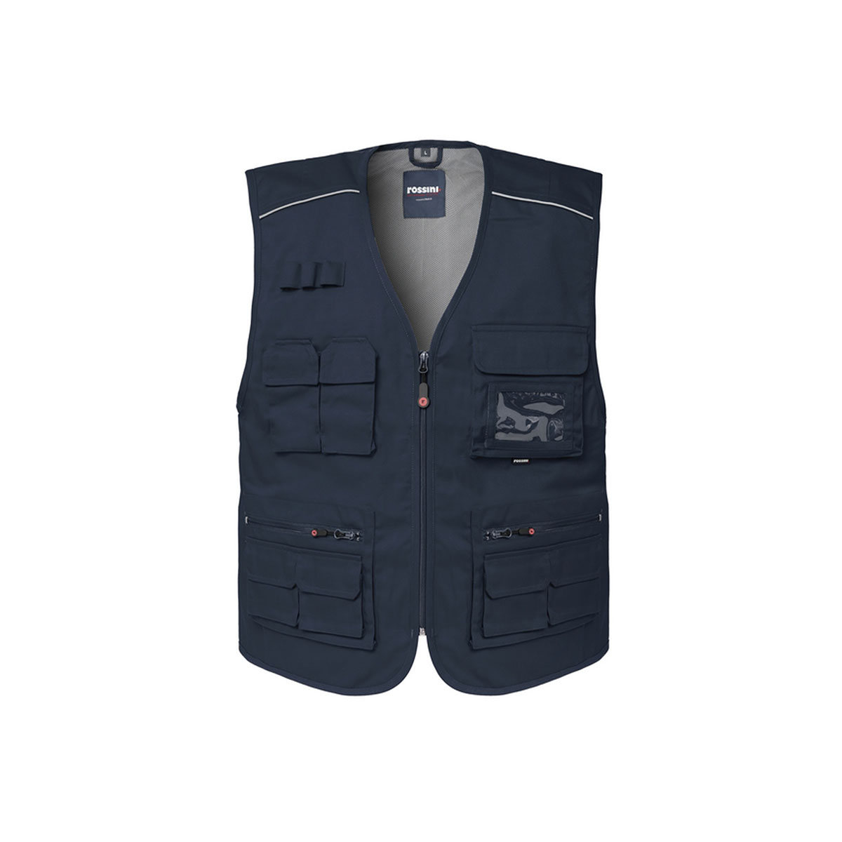 Gilet estivo con chiusura anteriore con cerniera, carré anteriore con profilo rifrangente a contrasto.