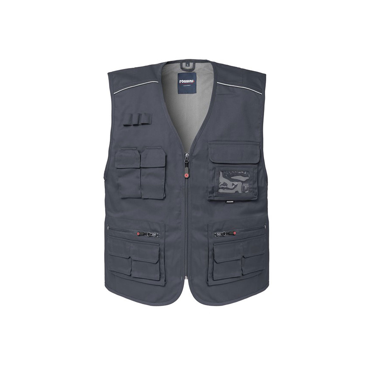 Gilet estivo con chiusura anteriore con cerniera, carré anteriore con profilo rifrangente a contrasto.