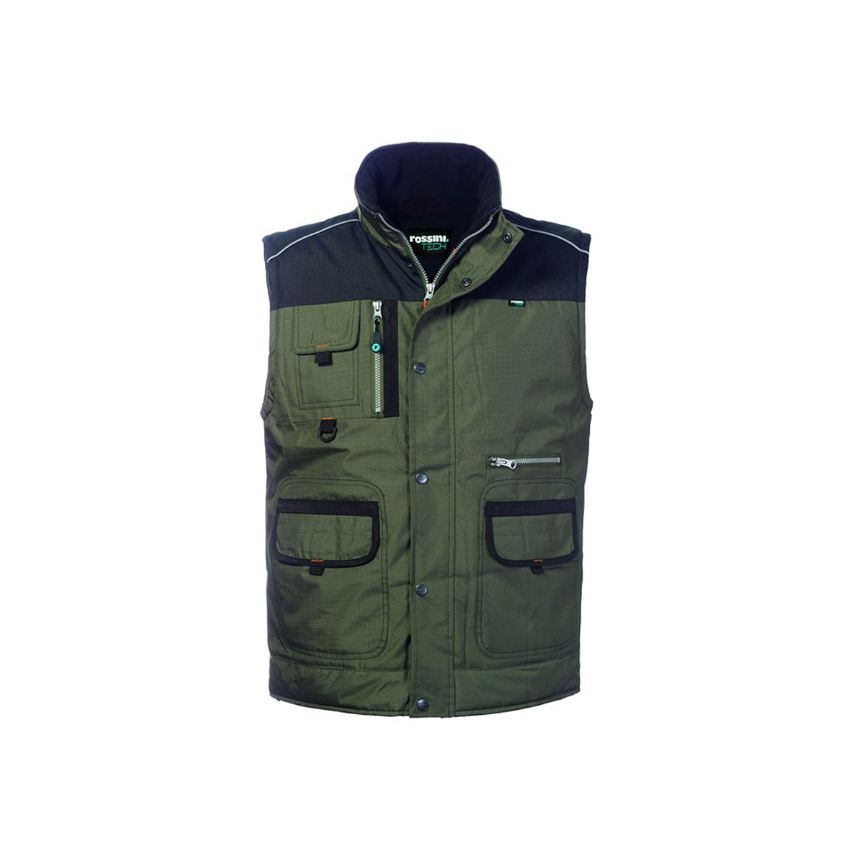 Gilet imbottito con chiusura anteriore con cerniera coperta da patella chiusa con bottoni automatici. |