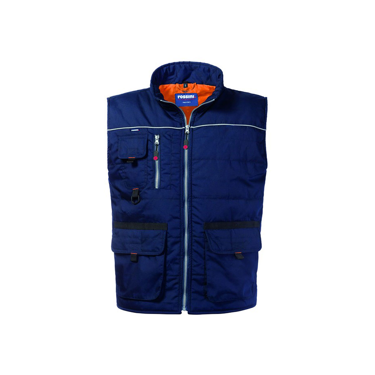Gilet imbottito con chiusura anteriore con cerniera, elastico interno al giromanica antifreddo e antivento, coda di topo rifrangente al carré anteriore e posteriore.