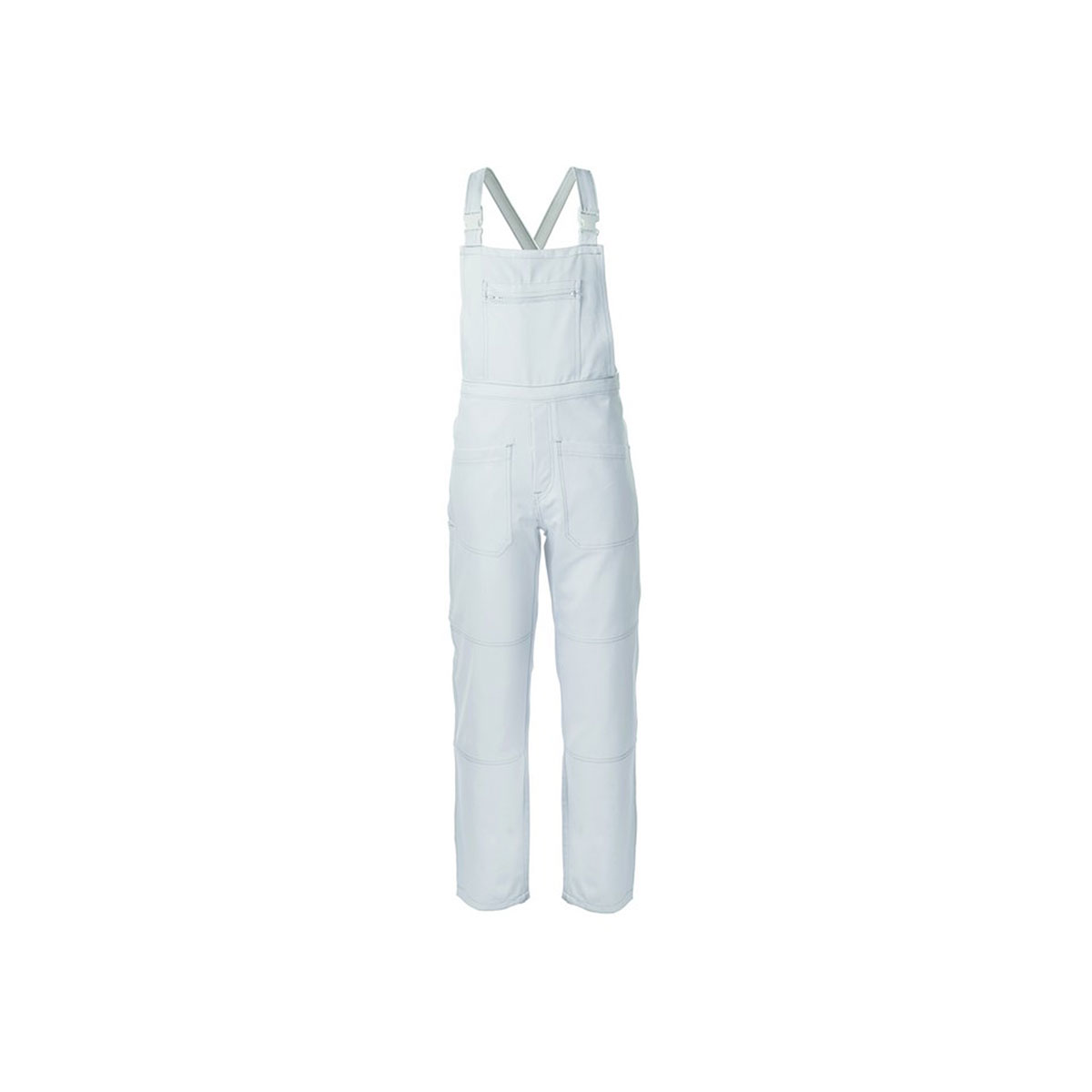 Pettorina da lavoro, bretelle incrociate con elastico interno e fibbie in plastica, con elastico in vita posteriore, chiusura alla patta con bottoni. Un tascone al petto chiuso con cerniera, due tasche anteriori, una tasca posteriore chiusa con bottone, un porta metro su gamba destra. Apertura laterale a destra chiusa con bottone, cuciture di colore a contrasto. |