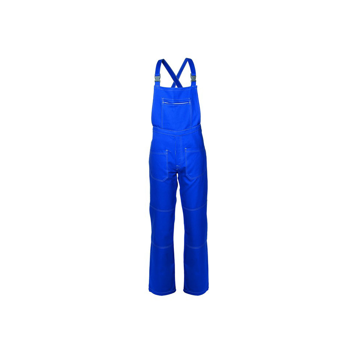 Pettorina da lavoro, bretelle incrociate con elastico interno e fibbie in plastica, con elastico in vita posteriore, chiusura alla patta con bottoni. Un tascone al petto chiuso con cerniera, due tasche anteriori, una tasca posteriore chiusa con bottone, un porta metro su gamba destra. Apertura laterale a destra chiusa con bottone, cuciture di colore a contrasto. |