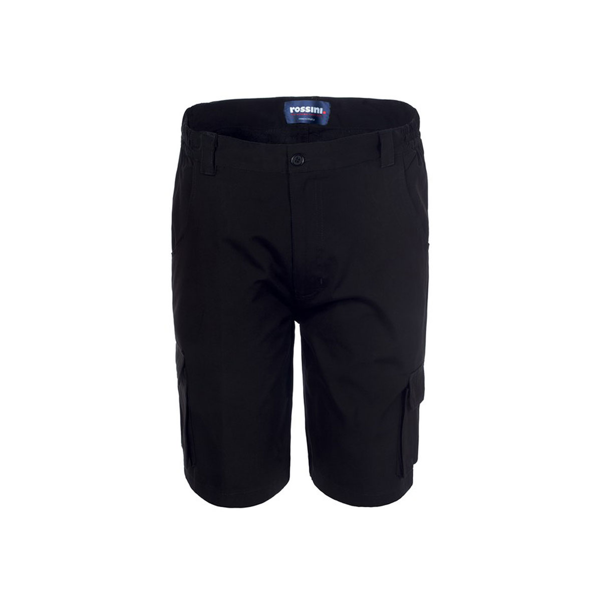Bermuda da lavoro con elastico ai fianchi, chiusura alla patta con cerniera e bottone in cintura. |