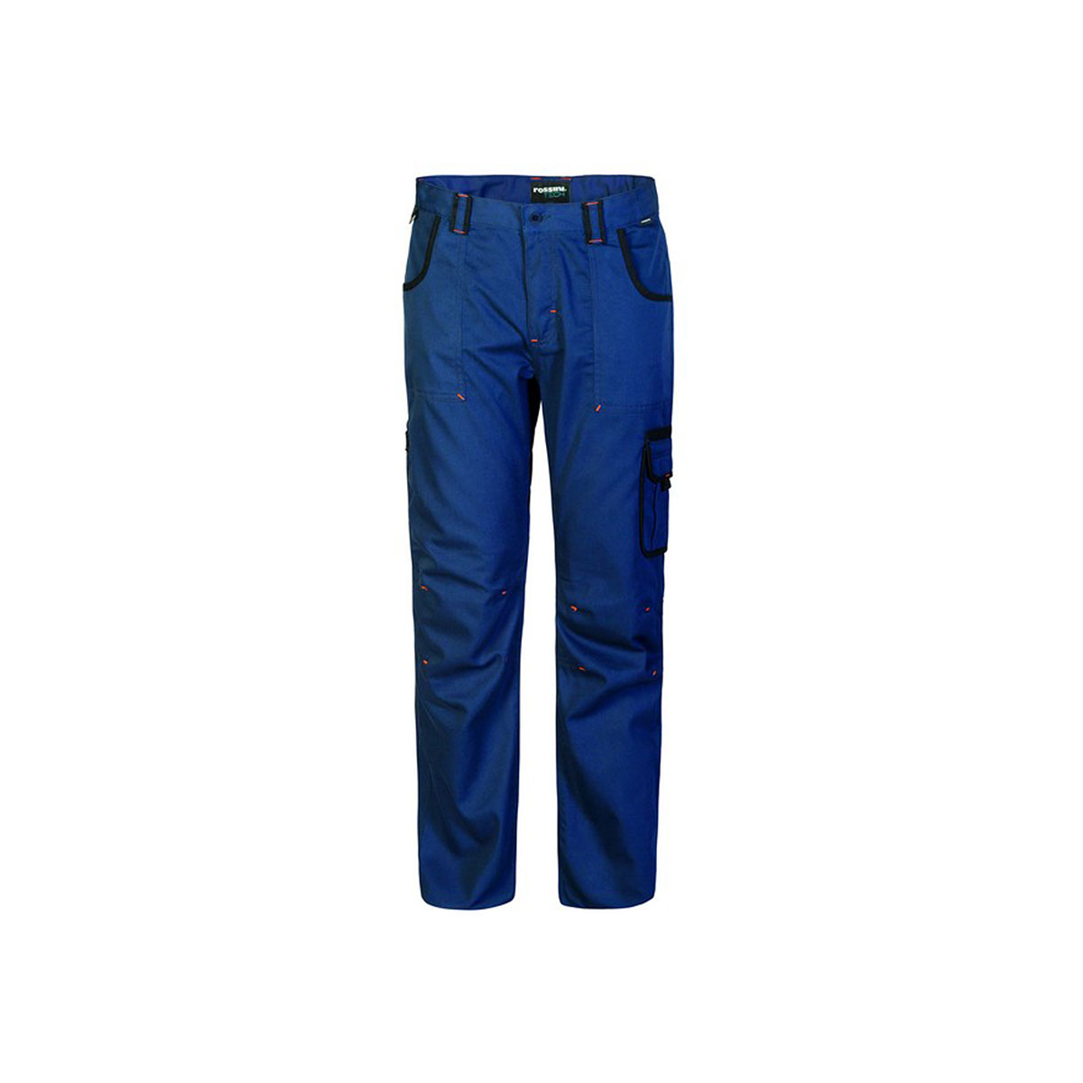 Pantalone da lavoro con elastico in vita regolabile, chiusura alla patta con cerniera e bottone alla cintura, passanti in cintura rinforzati con doppio tessuto.
