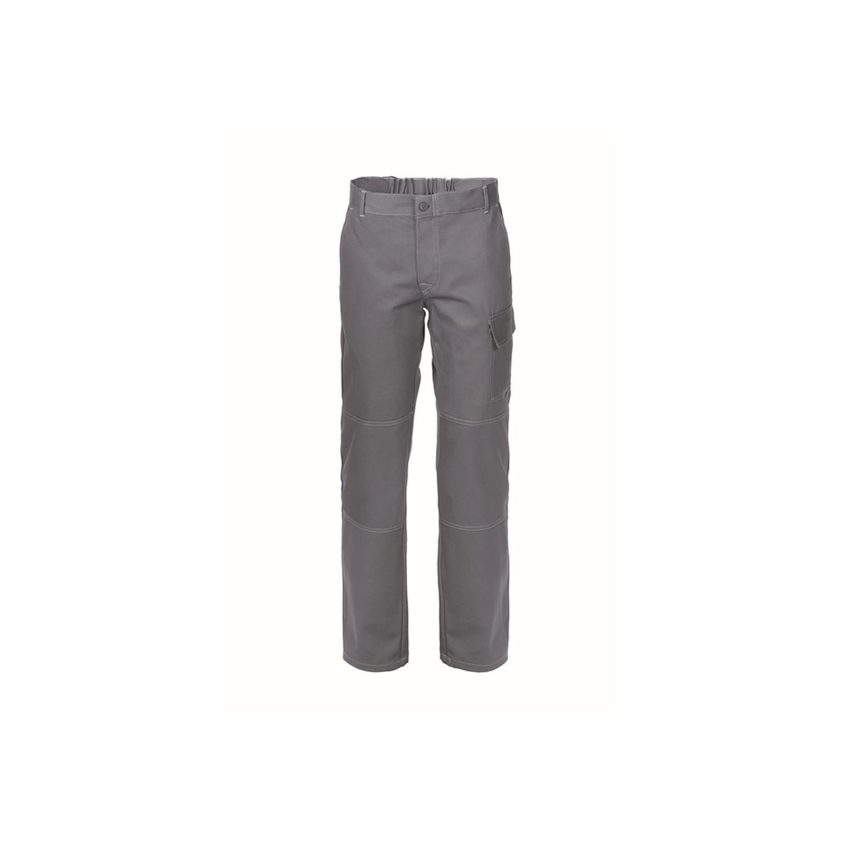 Pantalone da lavoro con elastico in vita posteriore, chiusura alla patta con cerniera e bottone scoperto, due tasche anteriori interne, una tasca posteriore applicata a destra chiusa con bottone, un porta metro, un portapenne e un tascone laterale applicati a sinistra chiusi con aletta e velcro, cuciture di colore a contrasto. |
