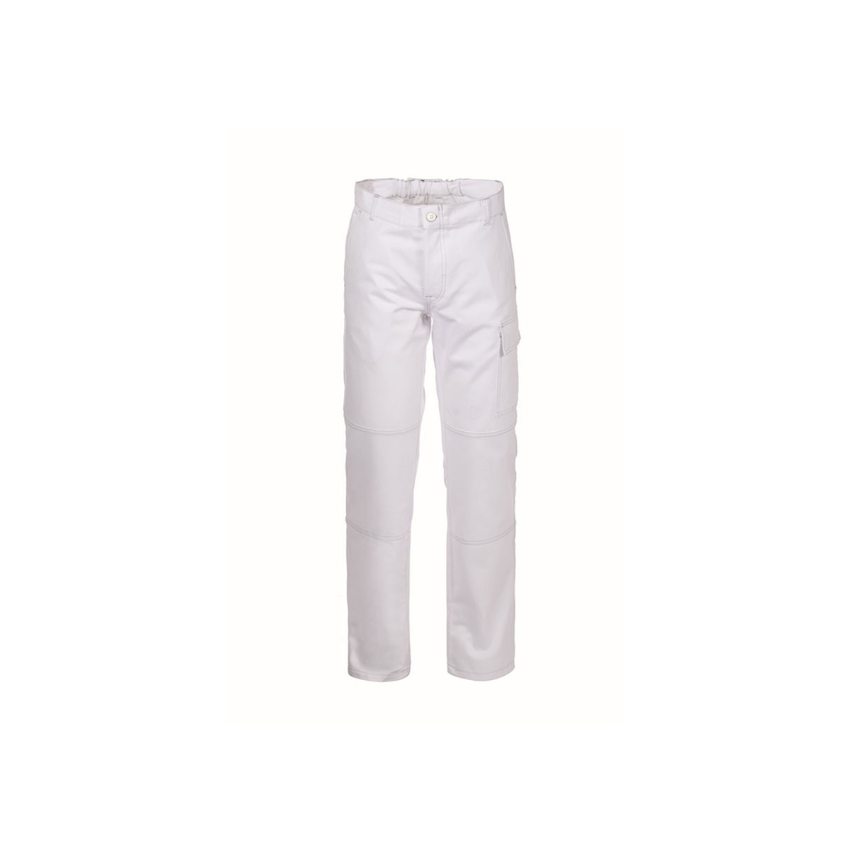 Pantalone da lavoro con elastico in vita posteriore, chiusura alla patta con cerniera e bottone scoperto, due tasche anteriori interne, una tasca posteriore applicata a destra chiusa con bottone, un porta metro, un portapenne e un tascone laterale applicati a sinistra chiusi con aletta e velcro, cuciture di colore a contrasto. |