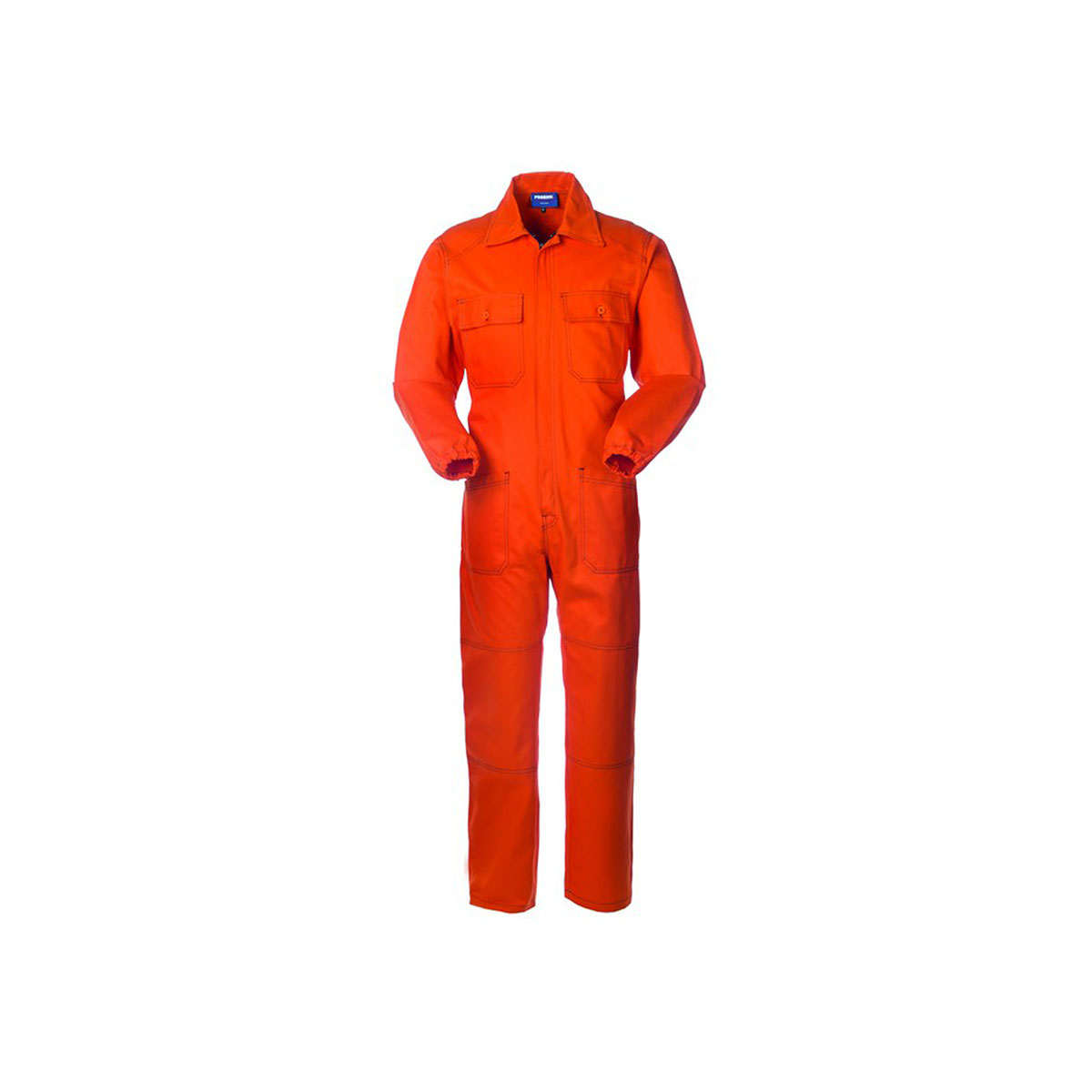 Tuta da lavoro con elastico in vita posteriore e chiusura centrale con zip a doppio cursore coperta da patella. |