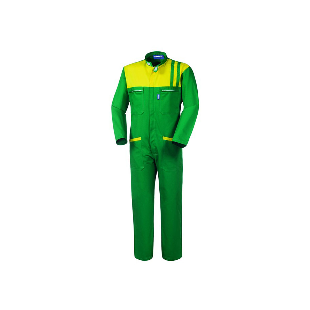 Tuta da lavoro con chiusura centrale con zip a doppio cursore coperta da patella, carré anteriore e profili su tasche di colore giallo, collo alla coreana chiuso con velcro. |