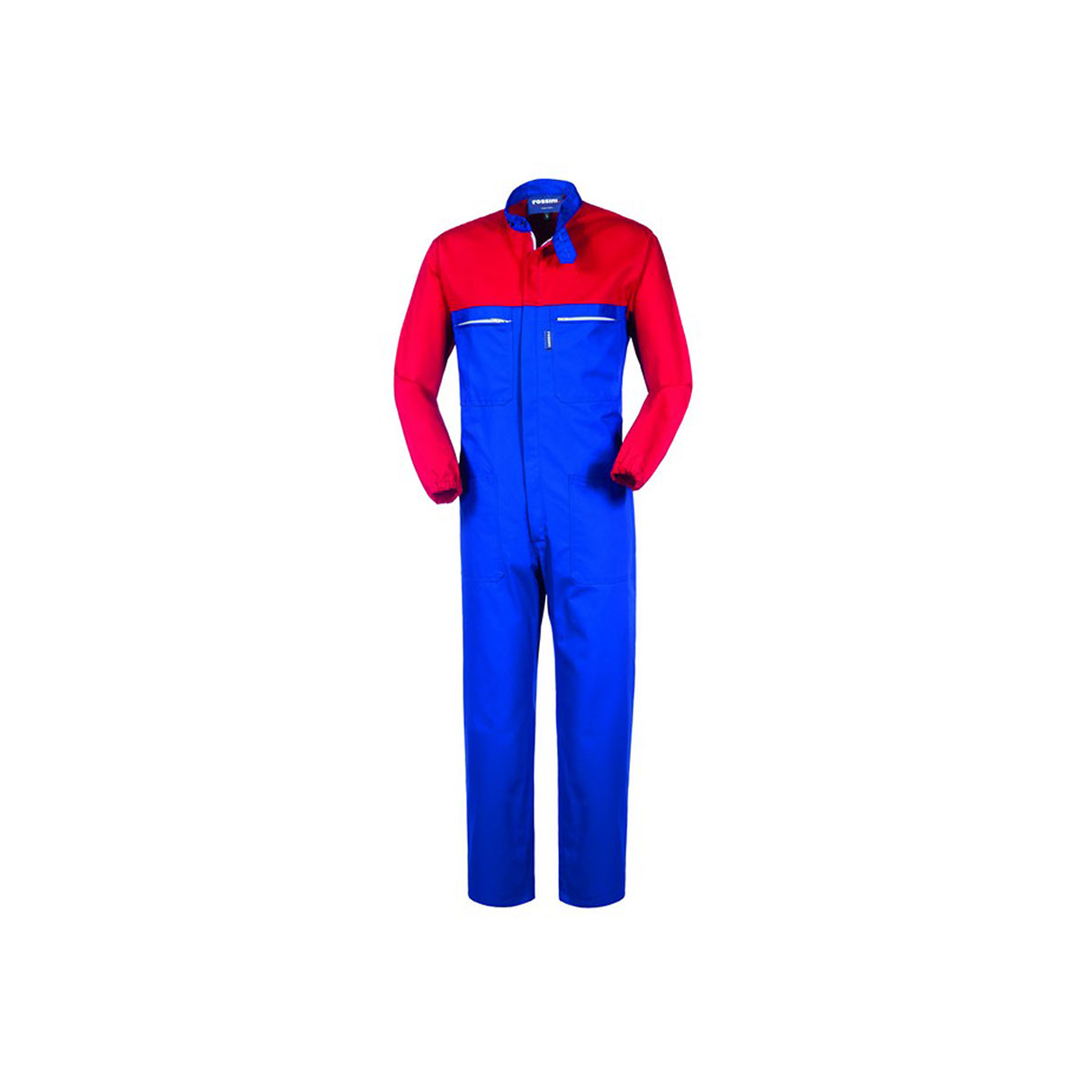 Tuta da lavoro con chiusura con cerniera centrale coperta, carré anteriore e posteriore e maniche di colore a contrasto, collo alla coreana chiuso con due bottoni. |