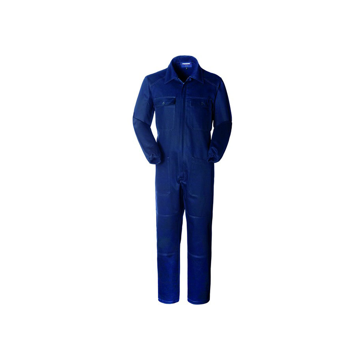 Tuta da lavoro con chiusura centrale con zip a doppio cursore coperta da patella ed elastico in vita posteriore. |