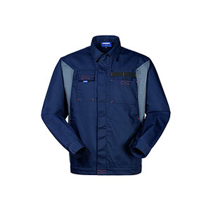 Tuta da lavoro con chiusura centrale con zip a doppio cursore coperta da patella, maniche raglan, collo alla coreana chiuso con due bottoni azzurri.