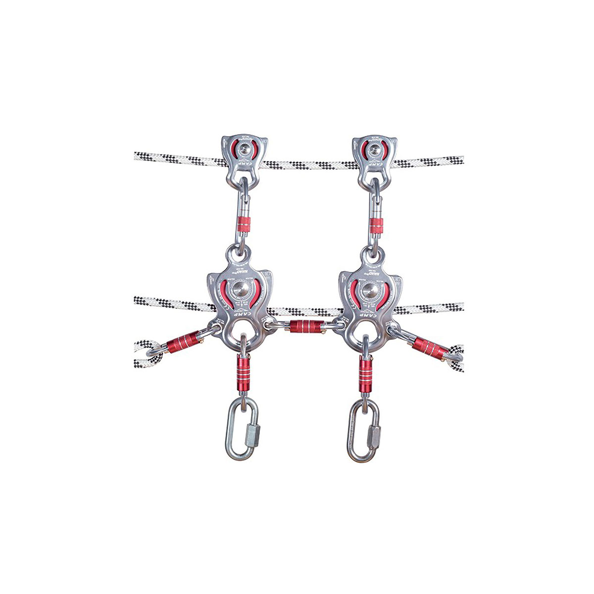 Carrucola multifunzione ad alta resistenza. Per la costruzione di paranchi e per manovre complesse. Ruota di grande diametro. Foro di attacco principale per tre moschettoni, due fori secondari laterali ed uno inferiore maggiorato. Per corde fino a 16 mm. Possibilità di utilizzo con nodo autobloccante Prusik, installabile da entrambi i lati. Rotazione su cuscinetto a sfere: elevata efficienza in utilizzo intensivo e ad alte velocità. Rendimento: 97%. Corpo e ruota in lega d’alluminio, asse in acciaio inox.