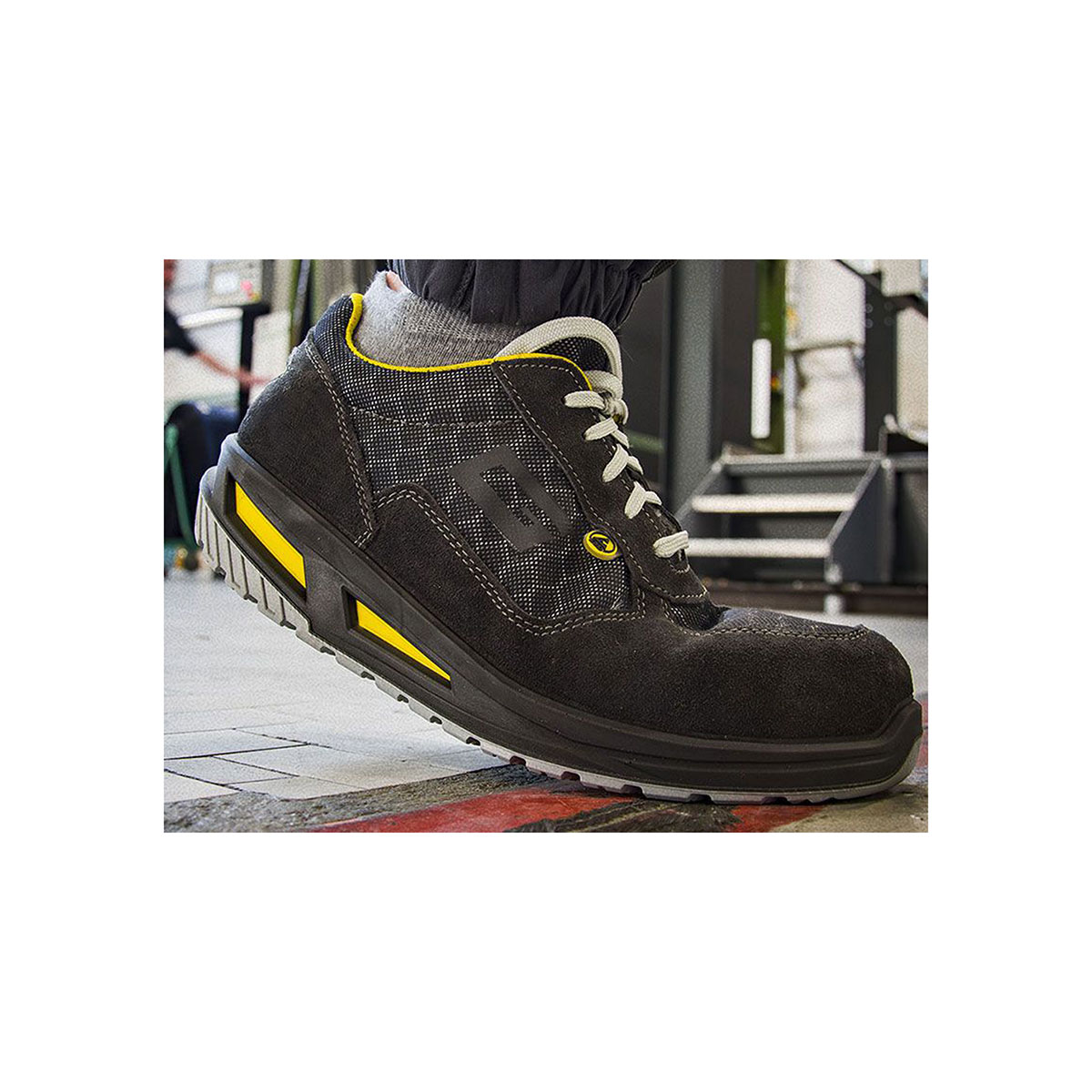 Scarpa antinfortunistica bassa, in pelle groppone scamosciato spessore 1,8-2,0 mm., e tessuto tecnico traspirante e resistente all' abrasione.